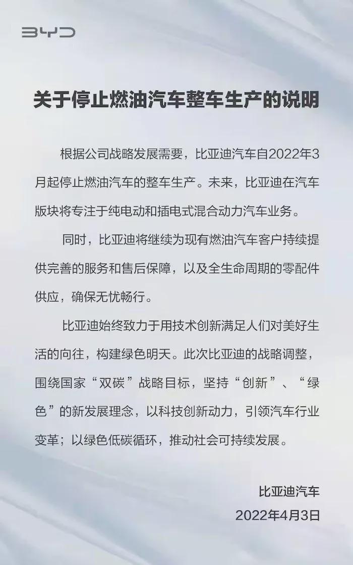 2022年4月,比亚迪发布公告,宣布公司自2022年3月开始,停止燃油汽车的整车生产,转而专注于纯电动车和插电式混合动力汽车的研发与销售。