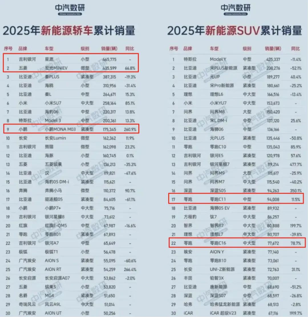 尤其是零跑汽车,凭借“全域自研+高配置低价”的极致策略,成为比亚迪在该区间的强劲对手。2025年零跑全年销量逼近60万辆,其中多款主力车型聚焦10-20万元市场,零跑C11定价14.98-18.58万元、零跑C16则以16.98-19.98万元定价,在配置上形成碾压优势。
