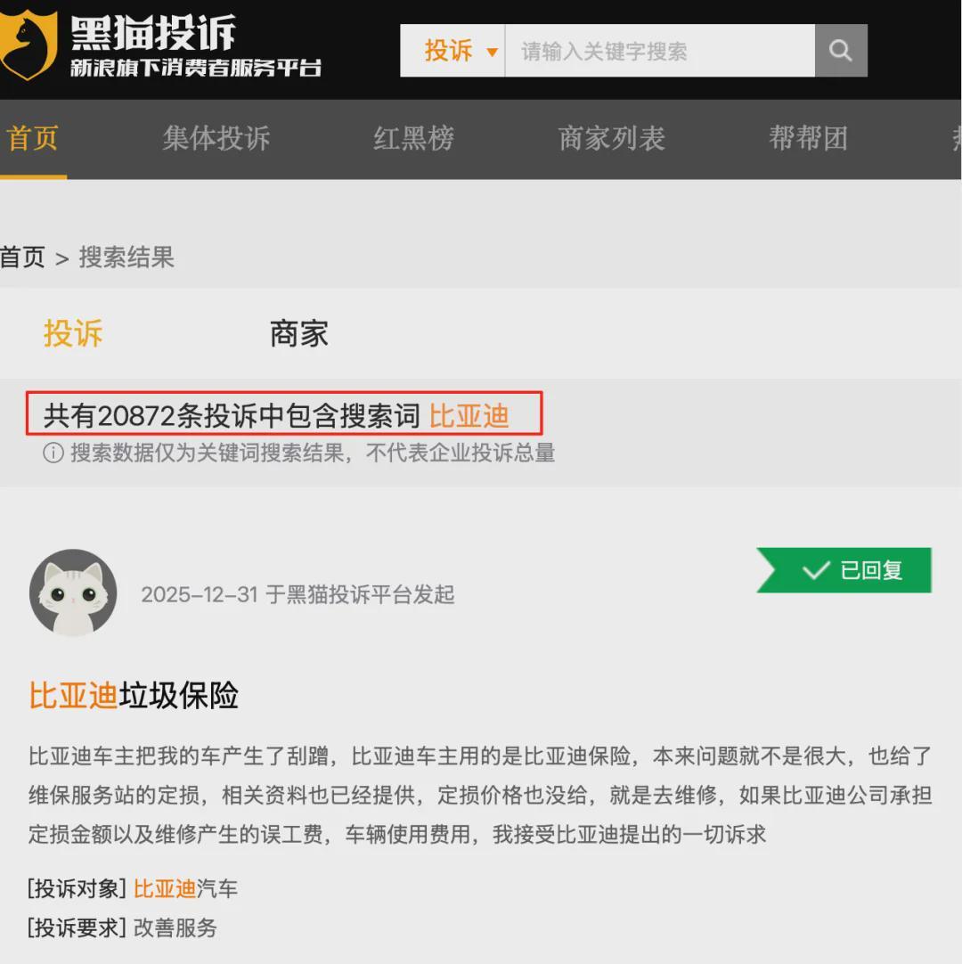除了密集召回,比亚迪在黑猫投诉平台的投诉数量也较多。在黑猫投诉搜索比亚迪,与之相关的投诉量达到20872条,其中“比亚迪汽车产品质量问题”“比亚迪汽车充电桩权益”“比亚迪宋LEV不到一年问题不断”等与产品质量相关的问题,屡见不鲜。